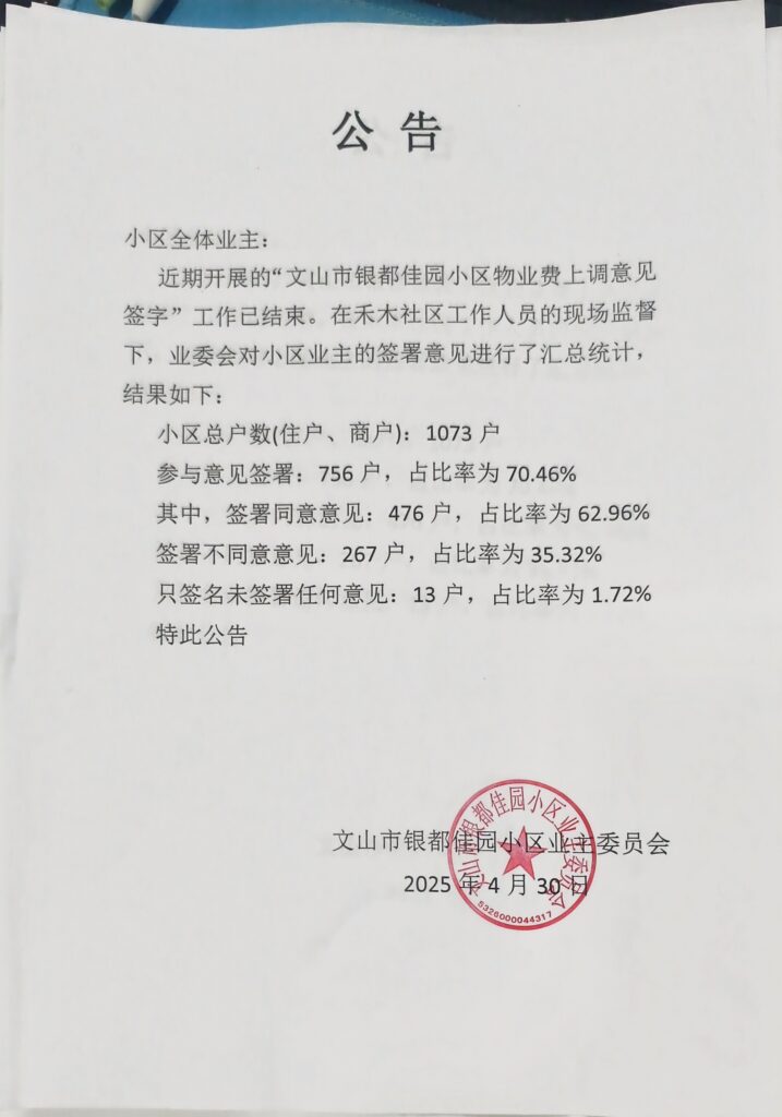 文山银都佳园业委会于2025年4月底5月初进行的同意续聘原物业,并同意物业费上调的意见征集结果(为突出重点,此处主要强调被调查总数):