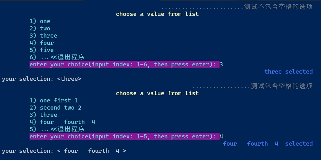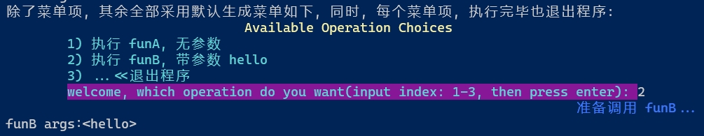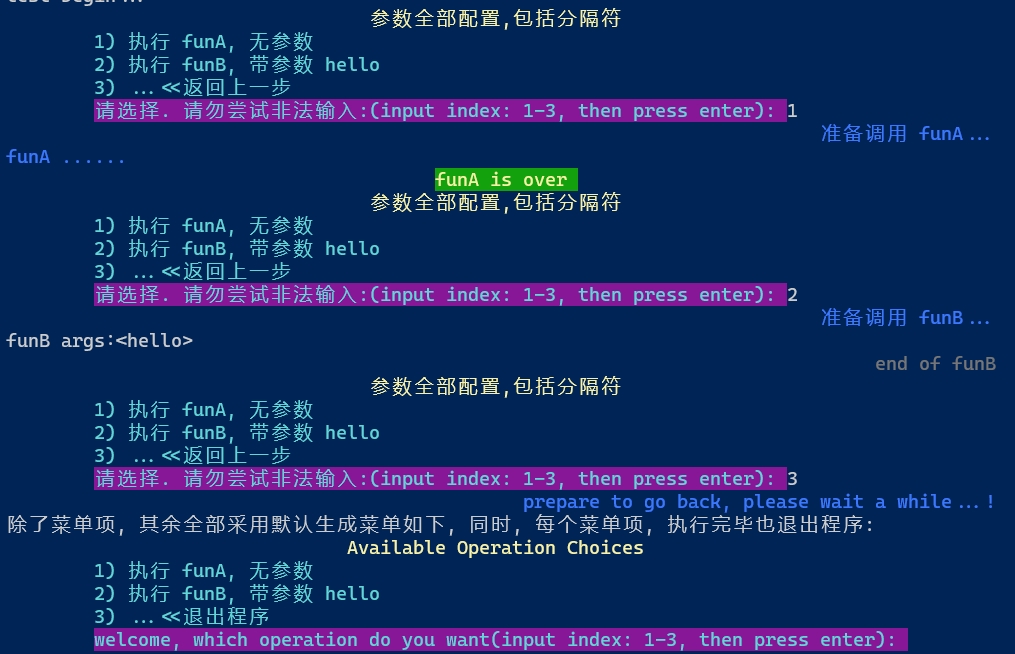 可以看到, 默认的 “退出程序” 被屏蔽, 选项 1 / 2 末尾均加入执行 way2, 而返回上一步则执行 way1, 符合一般常见用法. 当然, 生成环境中使用时, way1 中还应该配置进入 way2 的菜单项, 同时 way2 中一般也应该包含退出程序选项. 这里仅仅是示范菜单的生成, 这些工作就免了.