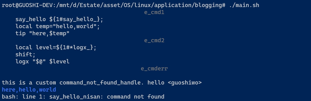注意 e_cmderr 是有意制造的不存在的函数, 表示它并不会引发错误, 仅仅是得到空函数体. 另外, call_logx 和 logx 函数位于 log.sh 中, 如下: