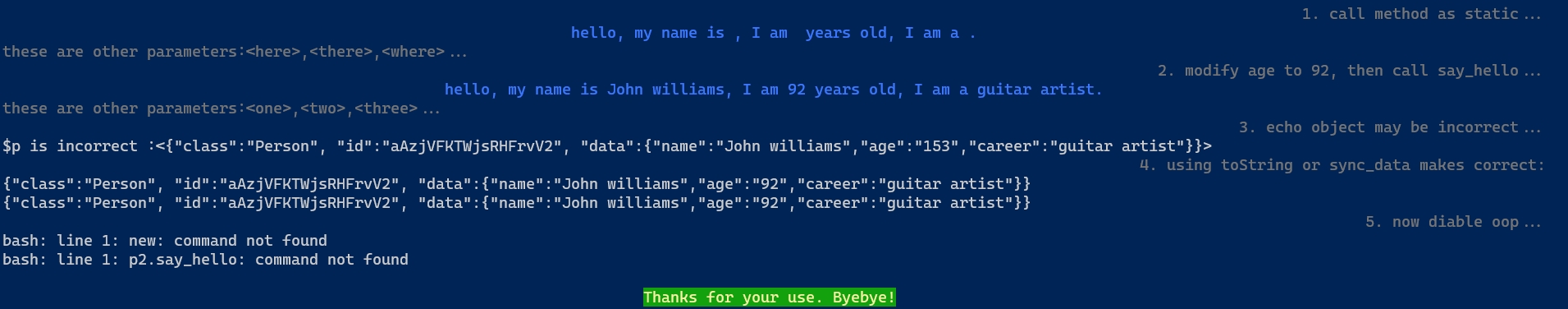 很明显, 这里的面向对象, 仅仅是简单实现. 因为面向对象的太多特点, 例如继承, 多态, 虚函数, 接口等等, 鉴于时间关系, 暂时无法实现. 有兴趣的朋友, 欢迎对此进行扩展! 当然, 如果某一天 bash 新版本在语法层面自己实现了面向对象, 这里做的所有工作就多余了呵.