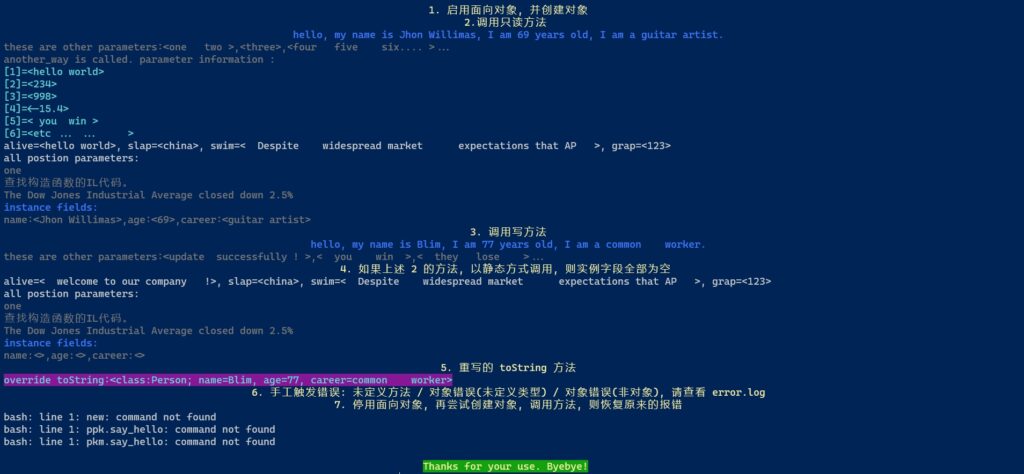 利用上一篇动态函数的科学实现提到的 command-not-found.sh 模块, 把 new 对象, 以及点操作符等面向对象的特有调用重定向为 linux shell 可执行的操作.